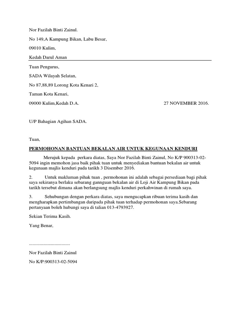 Senarai Semak Dokumen Permohonan Bekalan Air. Surat kiriman rasmi aduan masalah bekalan air surat kiriman rasmi aduan surat kiriman rasmi surat kiriman rasmi aduan surat kiriman rasmi untuk pinjaman barang surat kiriman rasmi ti. Dan sekiranya dibagi pula bantuan raya RM 200 seorang bagi kedua golongan berkenaan jumlah peruntukan hanya RM 7485400.