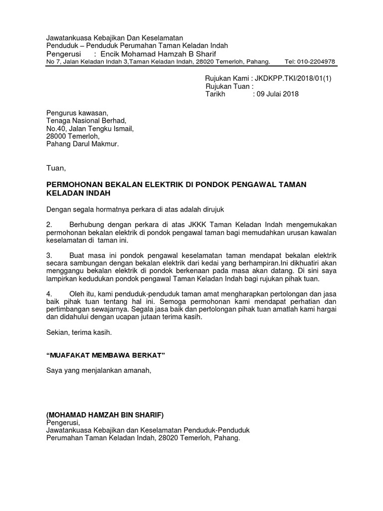 Contoh Surat Permohonan Surat Permohonan Elektrik Tnb